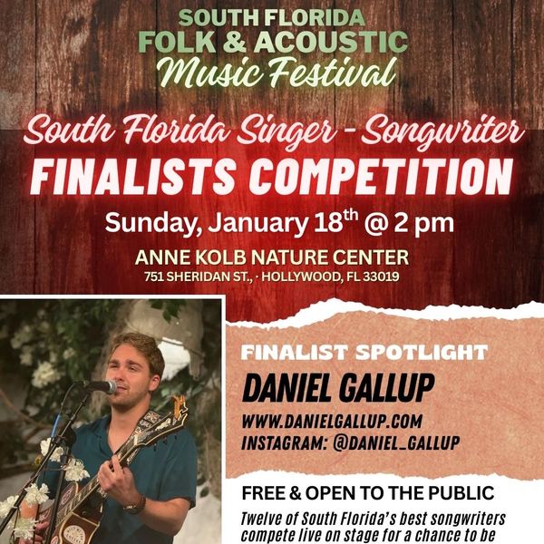 I was honored to be selected as one of 12 finalists in the South Florida Singer-Songwriter Finalist Competition for the South Florida Folk and Acoustic Music Festival. This is a competition highlighting original music in South Florida. The songs submitted were "Just Gray" and "All is Well" from my most recent EP "Just Daniel". It was a pleasure and privilege to receive this recognition!
